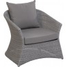 Fauteuil de jardin Zénith en résine outdoor coloris galet, avec son coussin coordonné gris.
